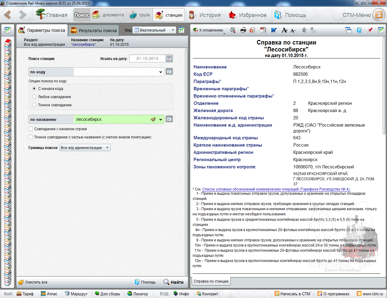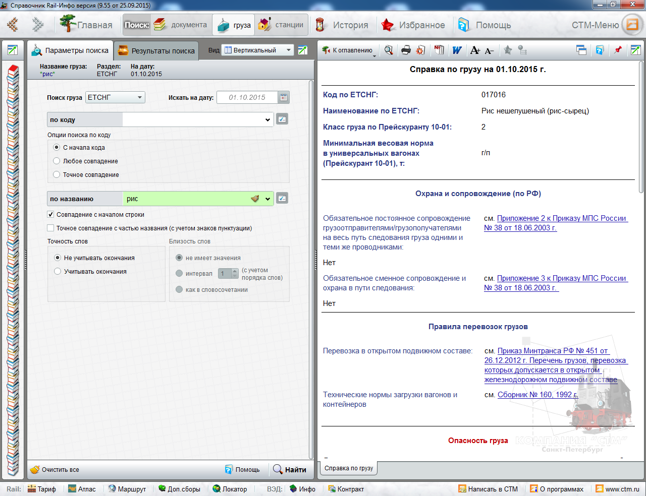 Специализированная информационно-справочная система, содержащая уникальную по объему и актуальности нормативно-правовую базу документов, регламентирующих перевозку грузов железнодорожным транспортом, номенклатуры грузов, а также перечни ж/д станций.